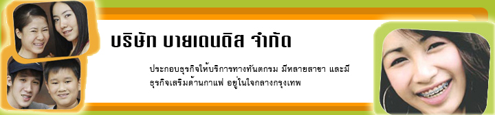 บริษัท บายเดนติส เป็นบริษัทฯ ที่ดำเนินธุรกิจเกี่ยวกับทันตกรรม โดยมีแพทย์ผู้ชำนาญงาน และเป็นที่รู้จักอย่างแพร่หลาย โดยมีลูกค้าทั้งไทย และต่างประเทศที่ให้ความสนใจเป็นลูกค้าของบริษัทฯ อย่างต่อเนื่อง นโยบายการดูแลลูกค้าของบริษัทเป็นไปอย่างคลอบคลุม และดูแลลูกค้าอย่างใกล้ชิด ที่อยู่ 226 ถนนพระราม1 แขวงปทุมวัน เขตปทุมวัน กรุงเทพมหานคร 10330 โทร 081-422-8800, 086-3077736 | แฟกส์ 02-2511123 ต่อ 24 |
