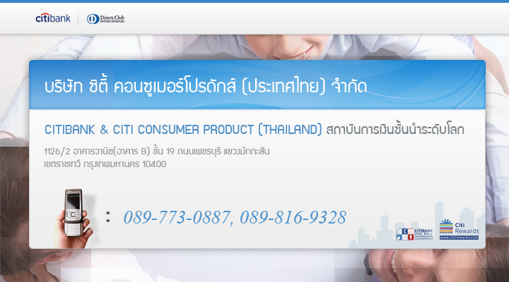 Citibank & Citi Consumer Product (Thailand) สถาบันการเงินชั้นนำระดับโลก ที่อยู่ 1126/2 อาคารวานิช(อาคาร B) ชั้น 19 ถนนเพชรบุรี แขวงมักกะสัน เขตราชเทวี กรุงเทพมหานคร 10400 โทร 089-7730887,089-8169328 | แฟกส์ 02-6849028 |